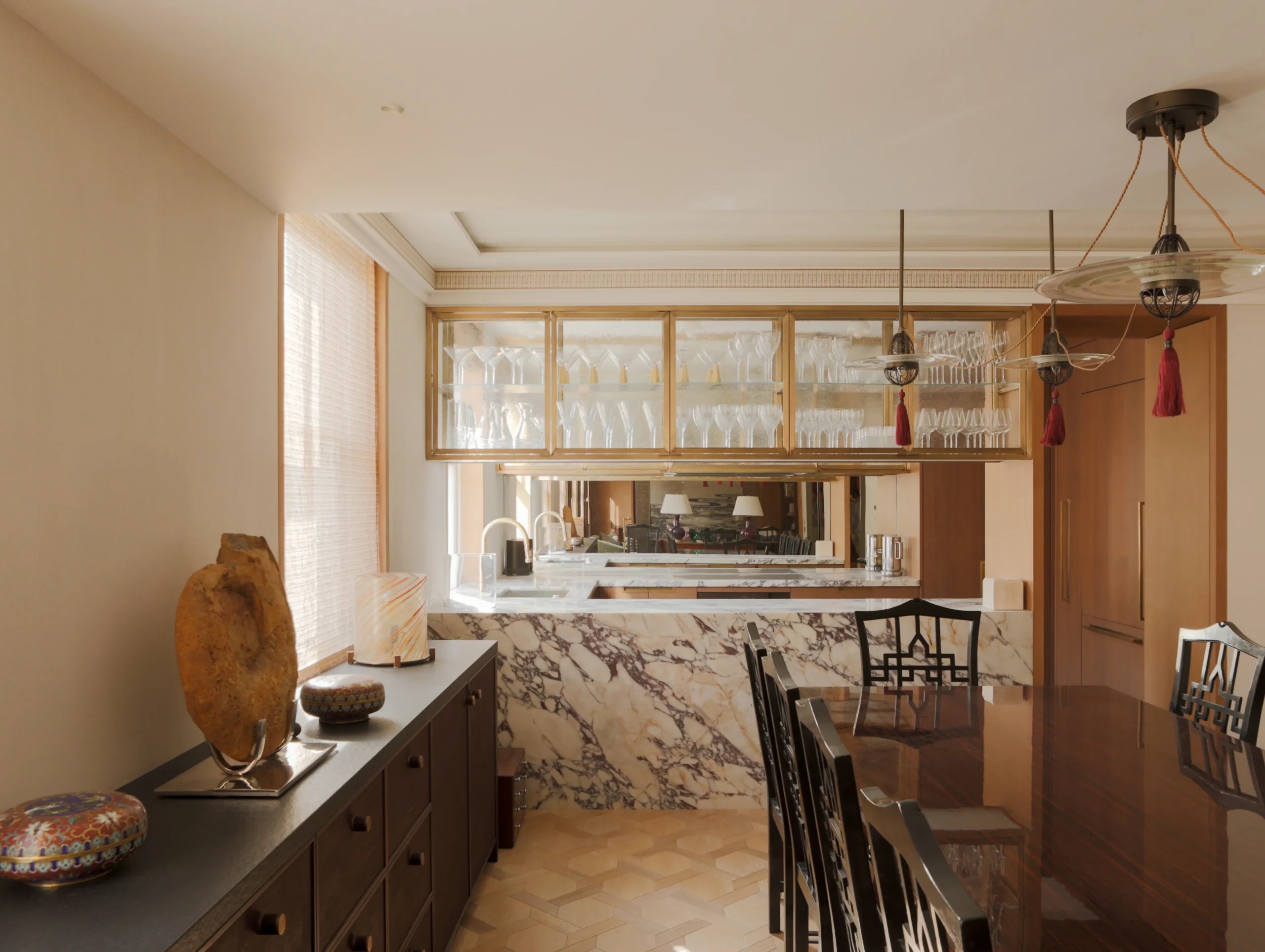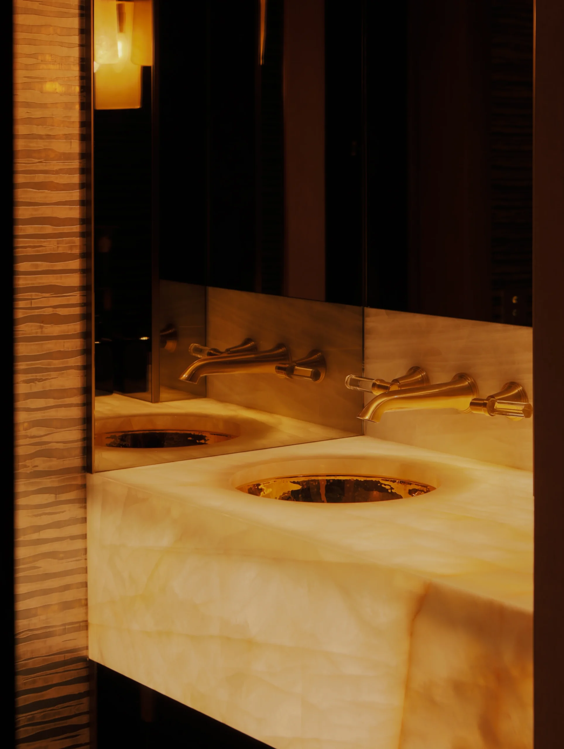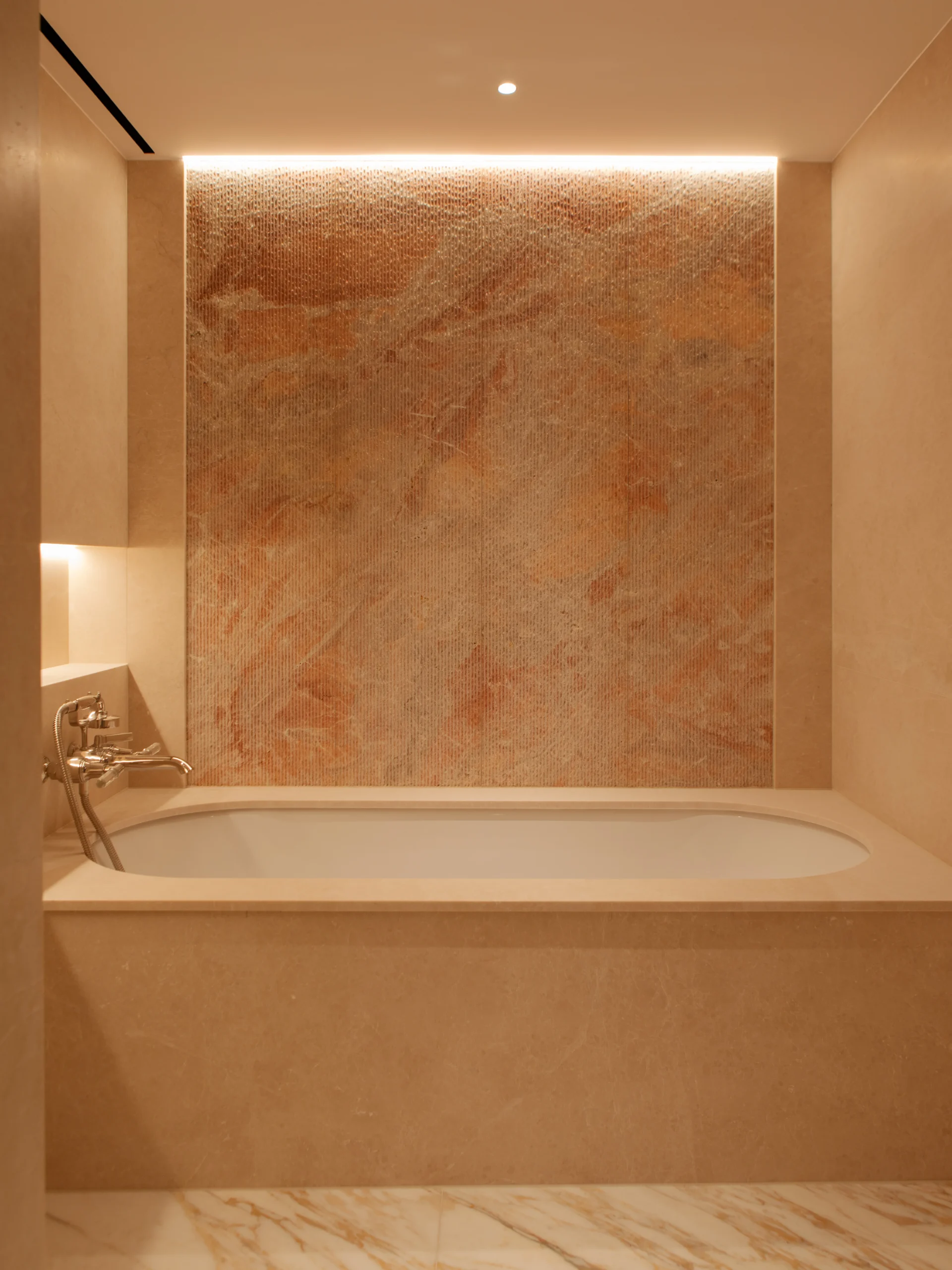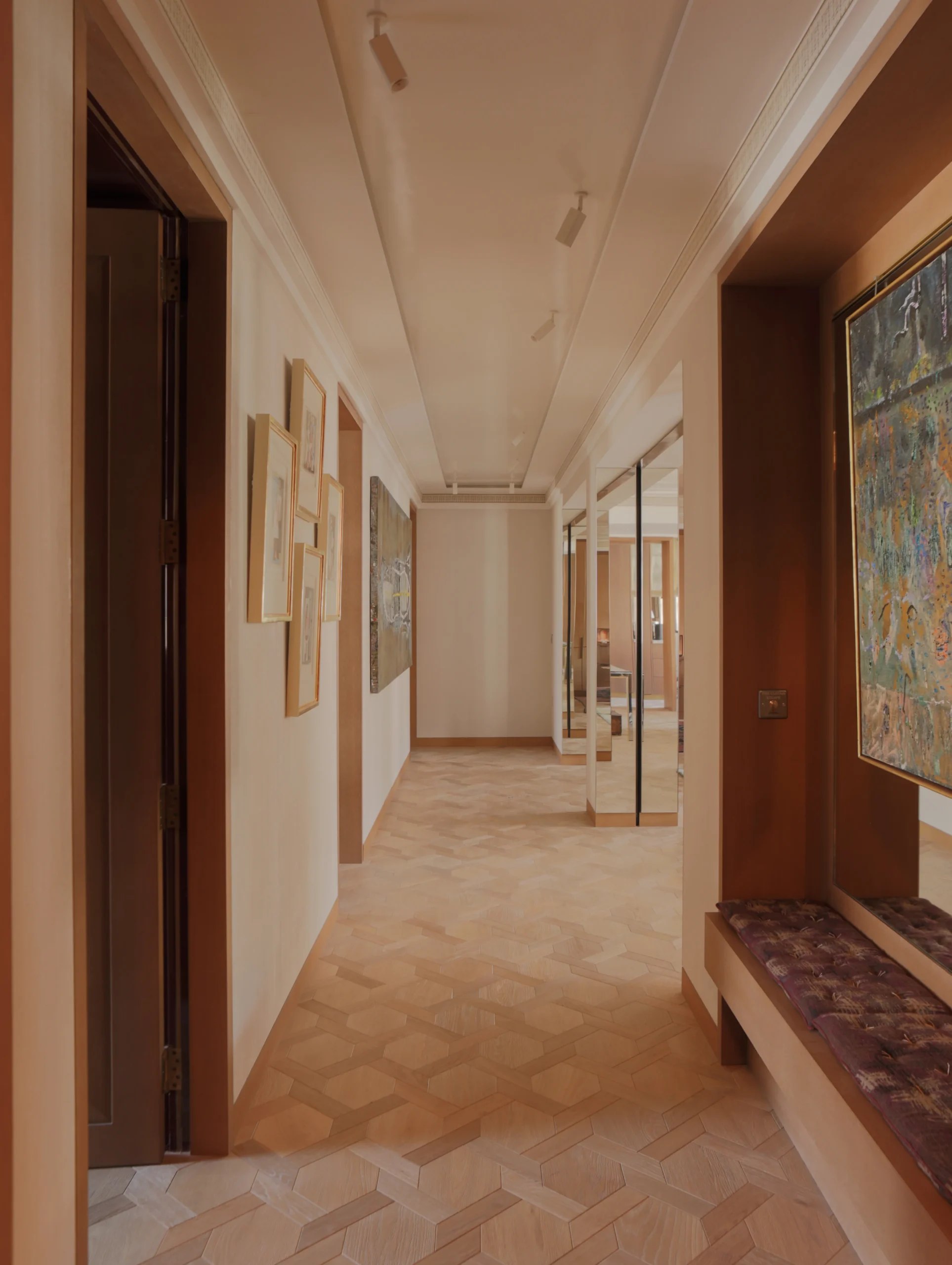 The extensive and rich material palette, developed collaboratively across architecture and interiors, is complemented by carefully integrated bespoke joinery and detailing, with our studio responsible for the overall architectural design and coordination. Particular attention was given to the display of an exquisite private art collection, with lighting carefully calibrated to enhance each piece and contribute to the home’s overall atmosphere.